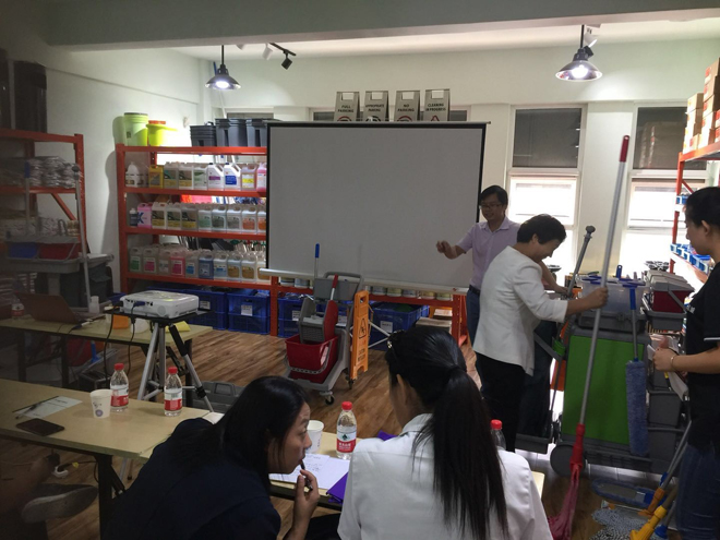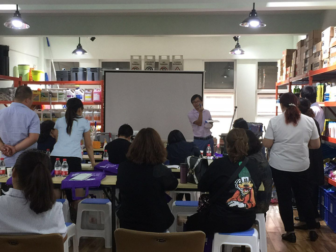 施達業務營運劉黎明經理與來賓們介紹清潔工具系統和標準化項目管理體系,以及分享產品使用體驗心得。