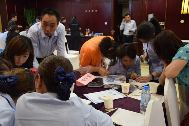 結(jié)合趣味小游戲,讓來賓們體會(huì)日常保潔的操作流程及分色管理的應(yīng)用,讓來賓們更好地運(yùn)用到管理中去,再加上擦玻璃的實(shí)操環(huán)節(jié),加深對(duì)聽講內(nèi)容的理解。