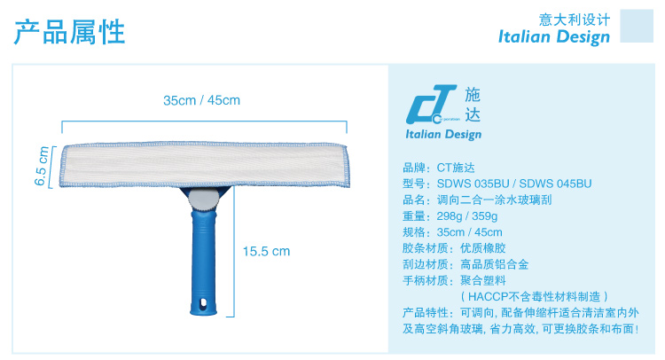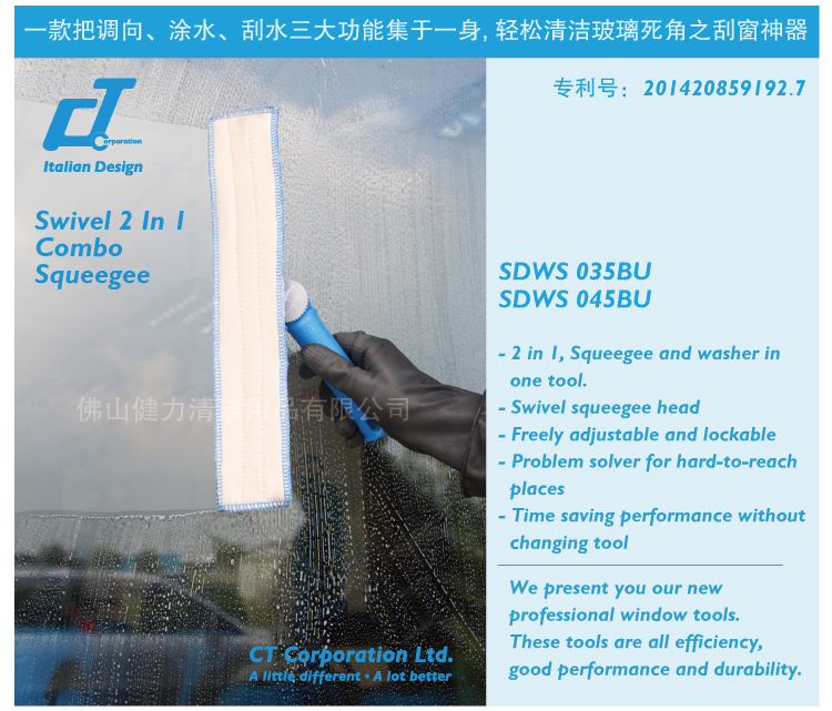 還在為清潔不到玻璃斜角、死角而沮喪?還在為涂水刮水需要不同工具不同工序而煩惱?沒關(guān)系,CT施達(dá)調(diào)向雙面玻璃刮來幫您!施達(dá)創(chuàng)新專利玻璃刮把調(diào)向、涂水、刮水三大功能集于一身,讓玻璃清潔輕松高效無死角。