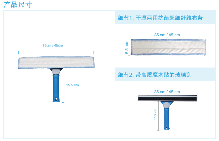 貫徹綠色環(huán)保清潔概念;膠條、魔術(shù)貼、清潔布、鋁合金條及調(diào)向手柄等各個(gè)配件均可輕松更換,同時(shí)可以匹配一桿通用的快接鋁桿,大大減低使用成本。