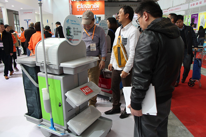 此次展示的新品之一:卷簾式儲物箱及靈巧型噴灑平拖SME 50,配合施達服務車能將衛生清潔及安全管理推向更高領域