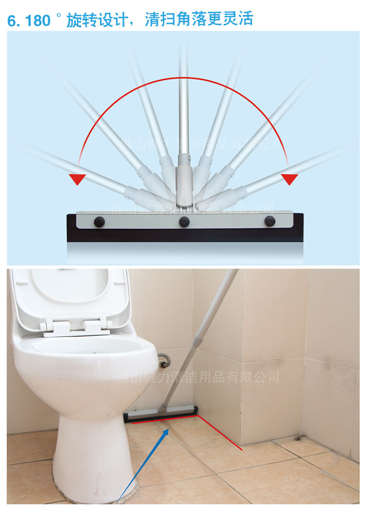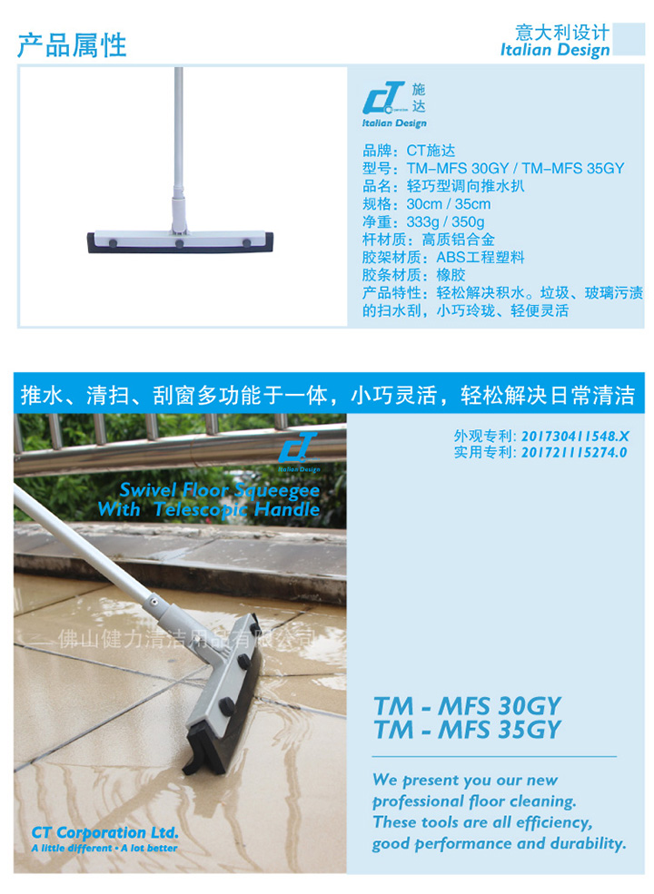 佛山施達現新推出一款專利產品: 輕巧型調向推水扒。它能滿足你日常推、掃、刮等清潔工作外,甚至讓您在狹窄空間(如洗手間)能靈活運用自如,該推水扒為180o手柄調向,雙層膠條設計讓它能夠靈活操作之余更能保證極佳的清潔效果,膠條及每個部件都能更換使用,大大降低使用成本同時充分體現了環保設計理念,除了推水功能之外還能滿足日常垃圾、毛發、灰塵的清掃以及墻面和玻璃刮水等工作,擁有這么一件功能齊全的工具,讓繁瑣的清潔也可以很輕松。